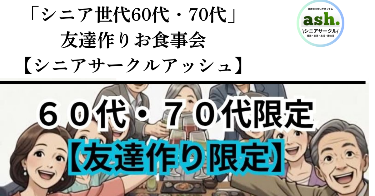 60代・70代で新しい友達を作りたい方へ。シニアサークルアッシュの友達作り限定食事会は、一人参加や初参加でも安心して楽しめる少人数交流会です。設立32年目の実績とやさしいサポートで、自然な出会いと外出のきっかけが広がりま […]