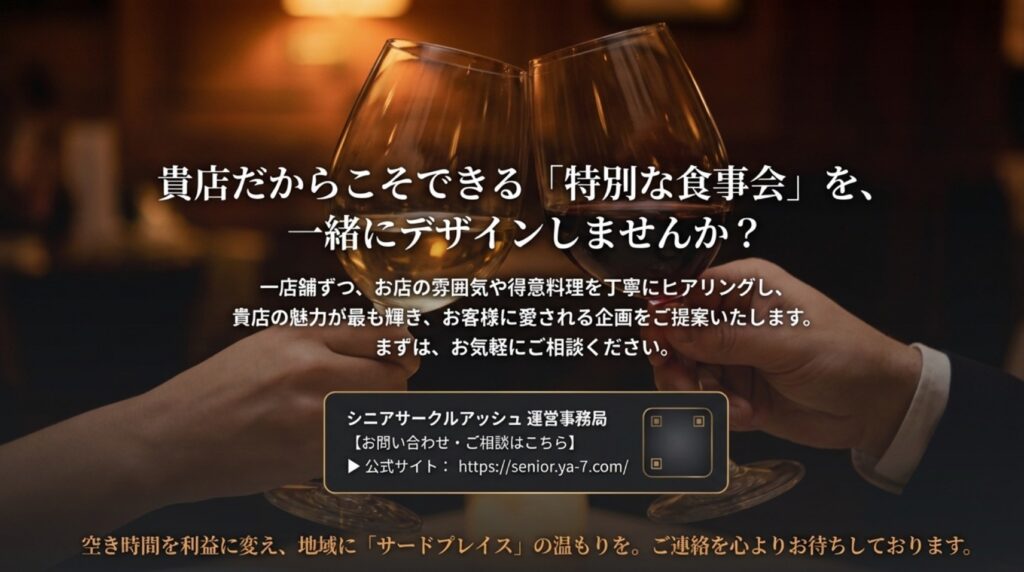 貴店が会場となってくださることは、単なる宴会スペースの提供ではありません。「地域の大人たちが安心して集い、孤独を癒やし、明日への活力を得るための大切な居場所を作ること」なのです。