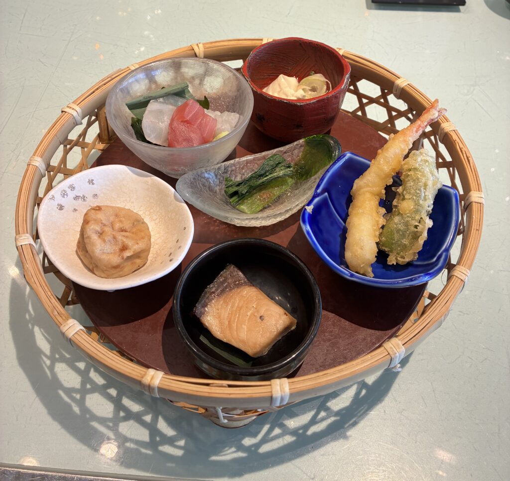目にも鮮やかな、竹籠五種盛り合わせから始まり、運ばれてくるたびに、「美味しいね」「盛り付けが綺麗!」と会話に花が咲きます。